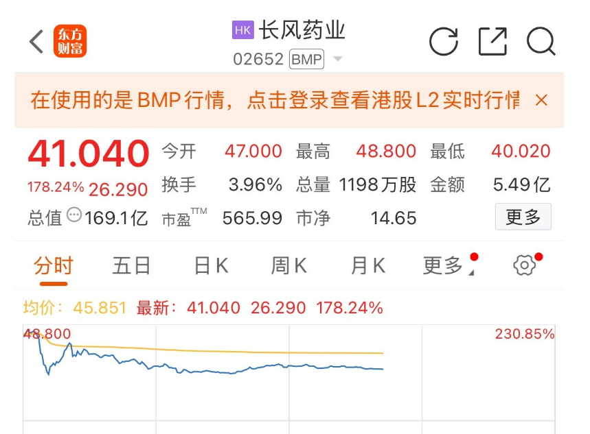 10月8日,长风药业在港股市场挂牌上市。上市首日,长风药业高开218.64%,开盘价为47港元/股,该股盘中最高涨至48.8港元/股,涨幅超230%。