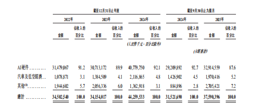 从业务构成来看,AI硬件业务已成为公司绝对主力。以2024年为例,公司AI硬件业务收入407.8亿元,同比增长32.8%,占总营收92.1%。而汽车及低空经济业务占比仅4.8%,其他业务占3.1%,显示出公司虽然在多元化布局,但AI硬件仍是当前增长的核心引擎。