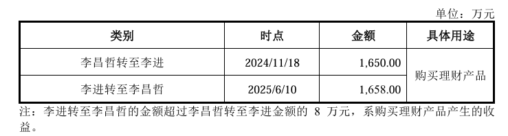 另外,报告期内,实控人父子之间存在资金往来。2024年11月18日,李昌哲转至李进1650万元。2025年6月10日,李进转至李昌哲1658万元,用于购买理财产品。