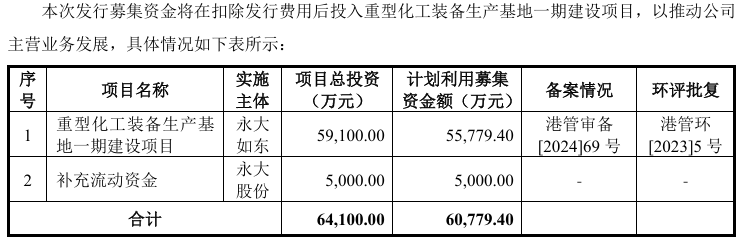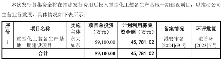 此次IPO,永大股份计划募资4.58亿元,全部用于重型化工装备生产基地一期建设项目。