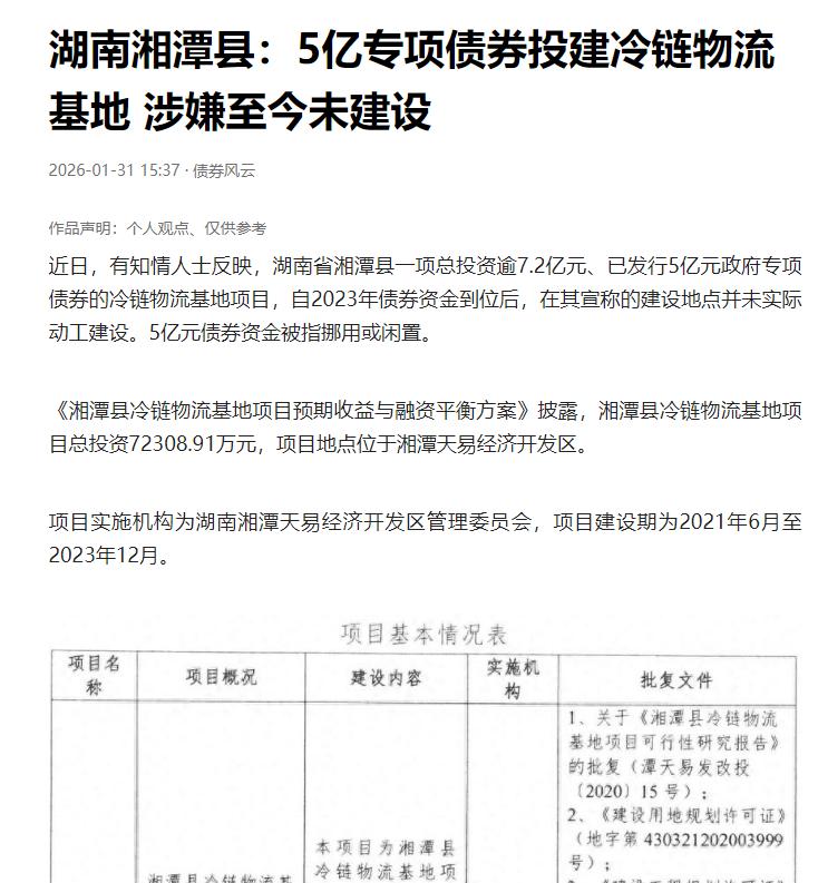 据债券风云报道:一项总投资逾7.2亿元、发行5亿元政府专项债券的湘潭县冷链物流基地项目,在债券资金2023年到位后,宣称的建设地点未见动工痕迹,5亿元资金去向成谜。这起疑似以虚假项目套取、挪用专项债的事件,不仅刺痛了公共财政的神经,更撕开了地方债务防控中的薄弱环节,在地方债务风险防控常态化的背景下,敲响了振聋发聩的警钟。
