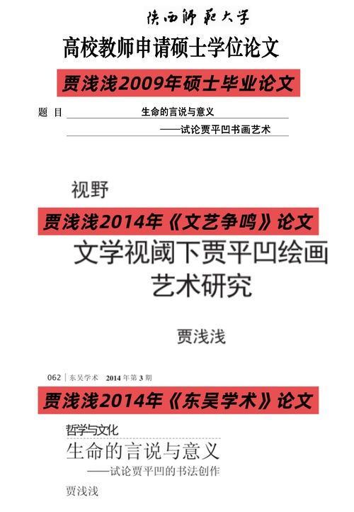 “抒情的森林”注意到,2009年,贾浅浅凭借毕业论文《生命的言说与意义——试论贾平凹书画艺术》获得陕西师范大学硕士学位;2014年3月,已身为西安建筑科技大学中文系讲师的贾浅浅在《东吴学术》发表论文《生命的言说与意义——试论贾平凹的书法创作》(2014年6月《中国现当代文学研究》转载); 2014年7月,贾浅浅又在《文艺争鸣》发表论文《文学视阈下的贾平凹绘画艺术研究》。