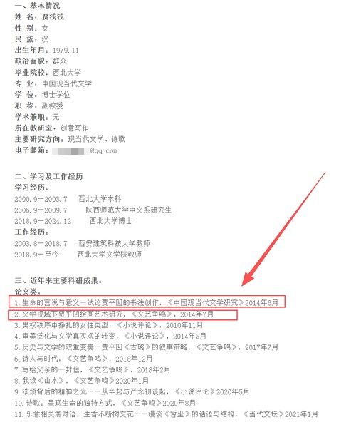 据“抒情的森林”梳理,贾浅浅将“论贾平凹书画”一文拆成“论贾平凹书法”和“论贾平凹绘画”两篇论文,先后登上三本学术期刊(含C刊),并以此拿下陕西师范大学硕士学位以及其此后任教职的西安建筑科技大学的青年科技基金项目,并列为其主要“科研成果”前两项。