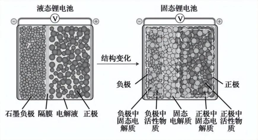 但固态电池也有着无可比拟的优点,下图是锂电池结构的变化,左边是液态电池,右边是固态电池。