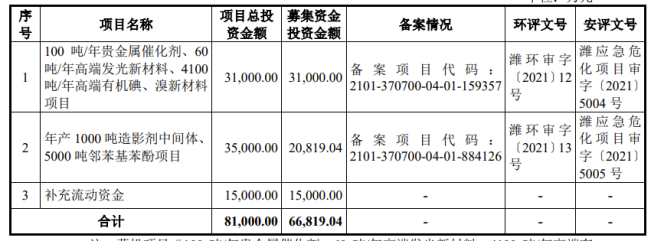 此次,博苑股份募投项目100 吨/年贵金属催化剂、60吨/年高端发光新材料、4100吨/年高端有机碘、溴新材料项目、年产 1000 吨造影剂中间体、5000 吨邻苯基苯酚项目,上述项目安评文号为潍应急危化项目审字〔2021〕5004 号、潍应急危化项目审字〔2021〕5005 号。