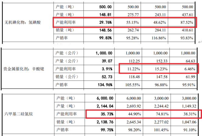 此外,招股书显示,博苑股份的无机碘化物:氢碘酸、贵金属催化剂:辛酸铑、六甲基二硅氮烷产能利用率明显偏低。其中,2021年-2023年及2024年上半年,贵金属催化剂:辛酸铑产能利用率为6.46%、15.23%、11.22%、3.91% 。