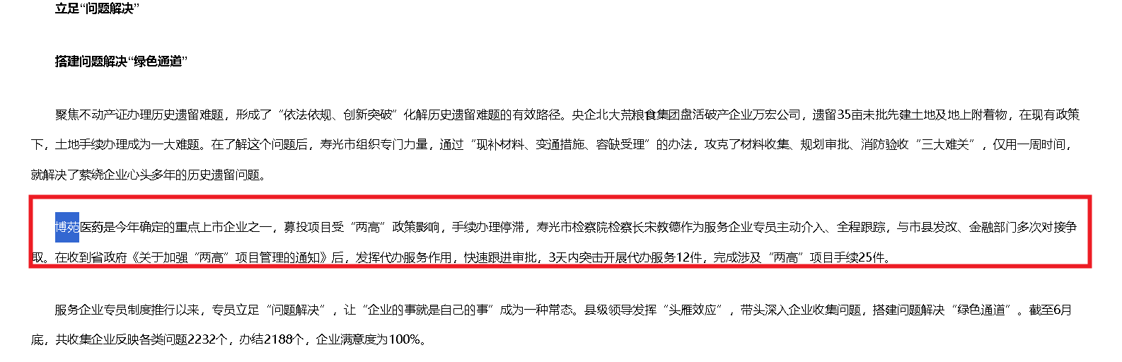 2021年7月,寿光市人民政府网站发布的一篇名为“做服务企业发展的“娘家人”来源显示为寿光日报,原文显示“博苑医药是今年确定的重点上市企业之一,募投项目受“两高”政策影响,手续办理停滞,寿光市检察院检察长宋教德作为服务企业专员主动介入、全程跟踪,与市县发改、金融部门多次对接争取。在收到省政府《关于加强“两高”项目管理的通知》后,发挥代办服务作用,快速跟进审批,3天内突击开展代办服务12件,完成涉及“两高”项目手续25件。”