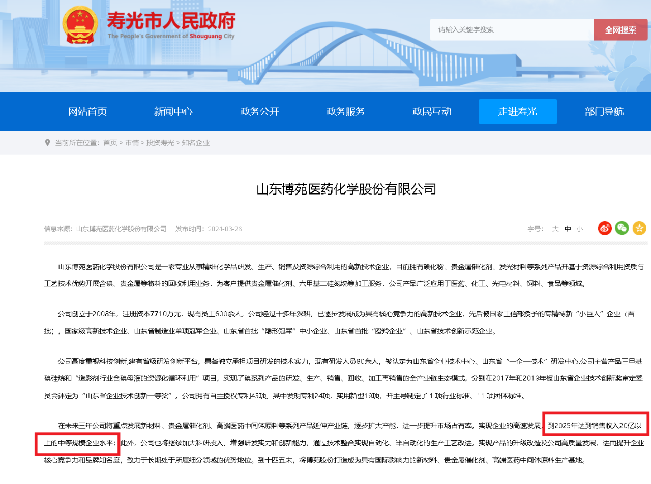 2024年3月寿光市人民政府网站发布了一批“知名企业”介绍,其中一篇标题为“山东博苑医药化学股份有限公司”的介绍显示信息来源为“山东博苑医药化学股份有限公司”。