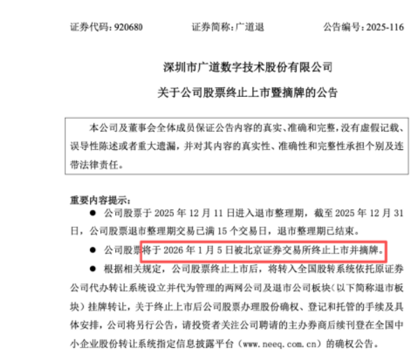 广道数字四年上市路走到终点。1月5日,广道数字(920680.BJ,退市整理期简称“广道退”)正式被北京证券交易所终止上市并摘牌。这是2026年的首只退市股,也是北交所设立以来,首例因重大违法被强制退市的上市公司。