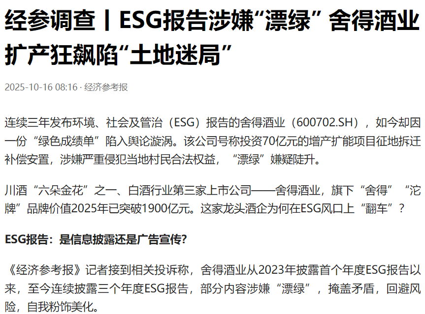 连续三年发布环境、社会及管治(ESG)报告的舍得酒业(600702.SH),如今却因一份“绿色成绩单”陷入舆论漩涡。该公司号称投资70亿元的增产扩能项目征地拆迁补偿安置,涉嫌严重侵犯当地村民合法权益,“漂绿”嫌疑陡升。